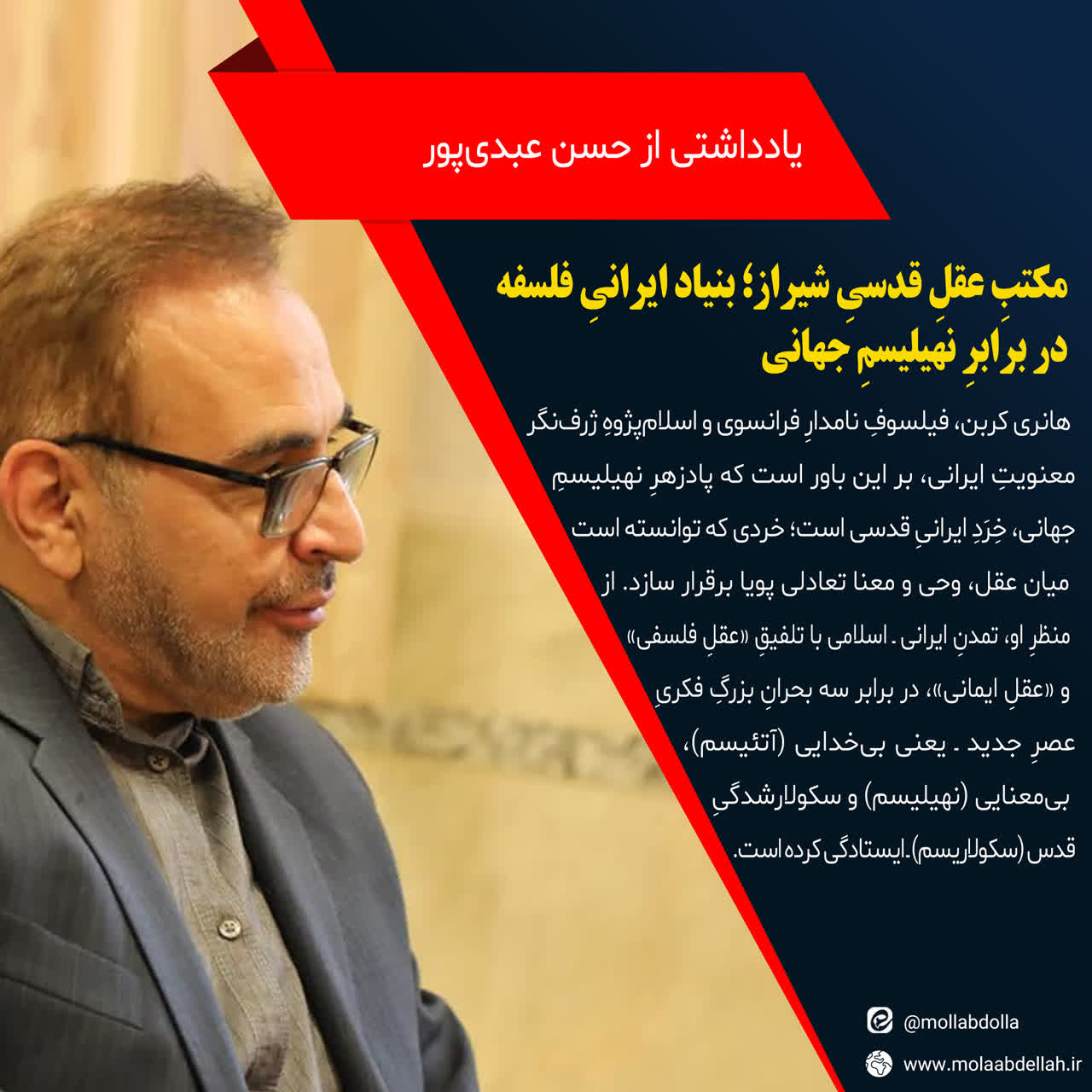هانری کربن تصریح دارد که حذفِ عنصرِ قدسی از عقل، به زایشِ نهیلیسم در غرب انجامید. در مکتبِ شیراز، عقل در کنارِ وحی تعریف میشود و هر دو راهی واحد بهسویِ حقیقت دارند.
