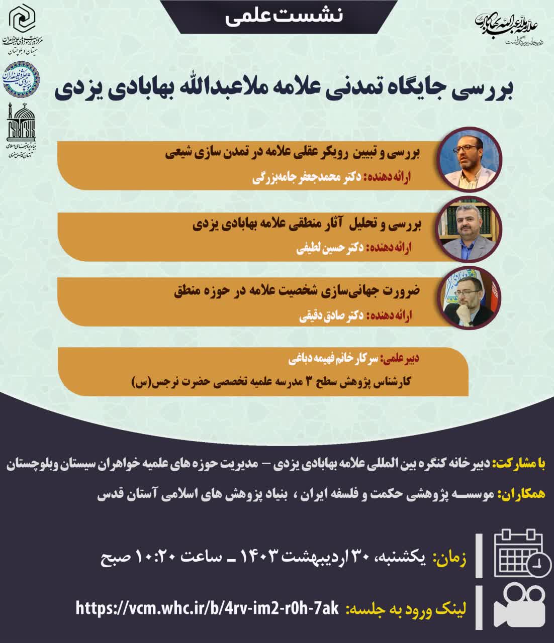 دکتر صادق دقیقی موضوع : ضرورت جهانی سازی شخصیت علامه در حوزه منطق دبیر علمی "سرکار خانم فهیمه دباغی .کارشناس پژوهش سطح ۳ مدرسه علمیه تخصصی حضرت نرجس سلام الله علیها زاهدان