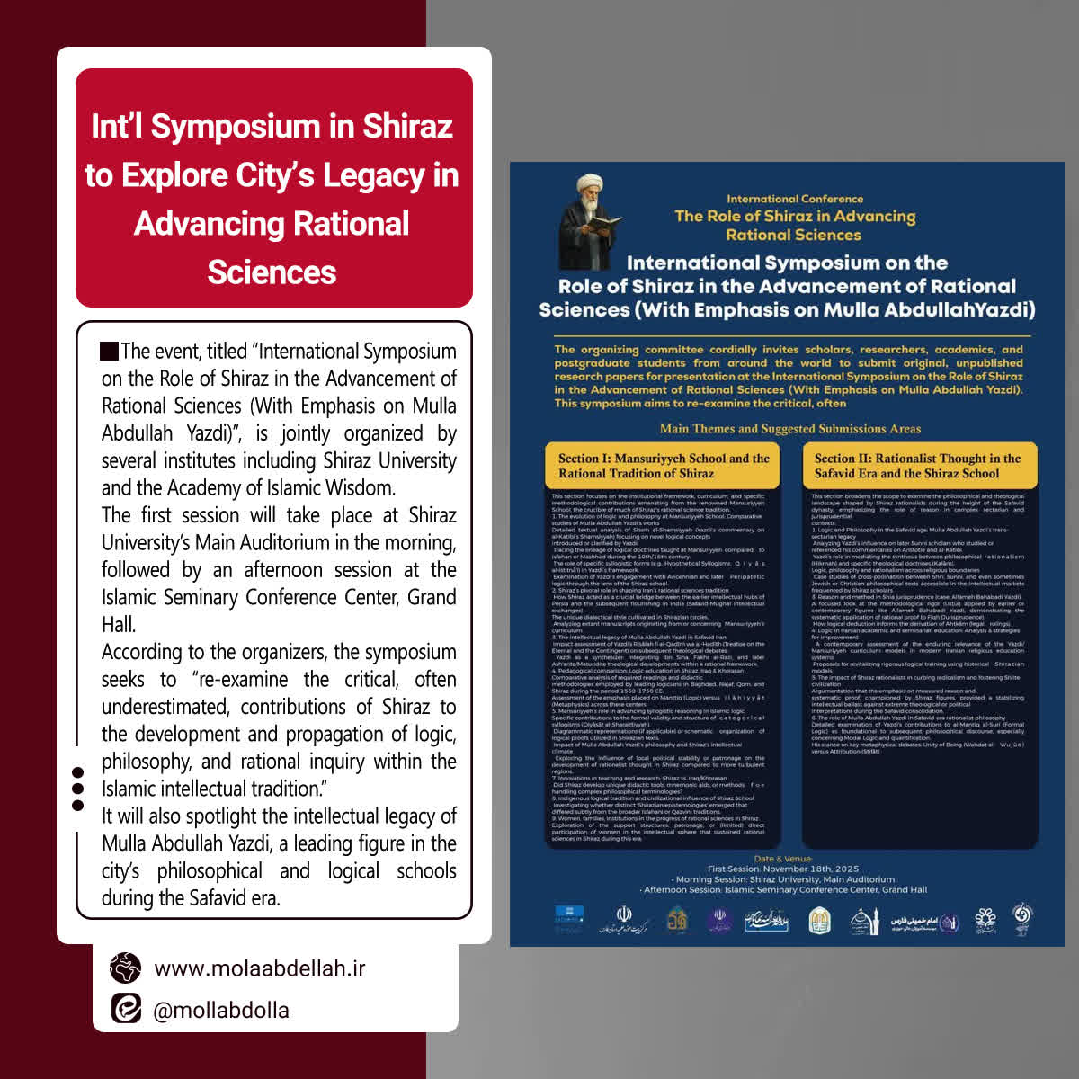 The event, titled “International Symposium on the Role of Shiraz in the Advancement of Rational Sciences (With Emphasis on Mulla Abdullah Yazdi)”, is jointly organized by several institutes including Shiraz University and the Academy of Islamic Wisdom.