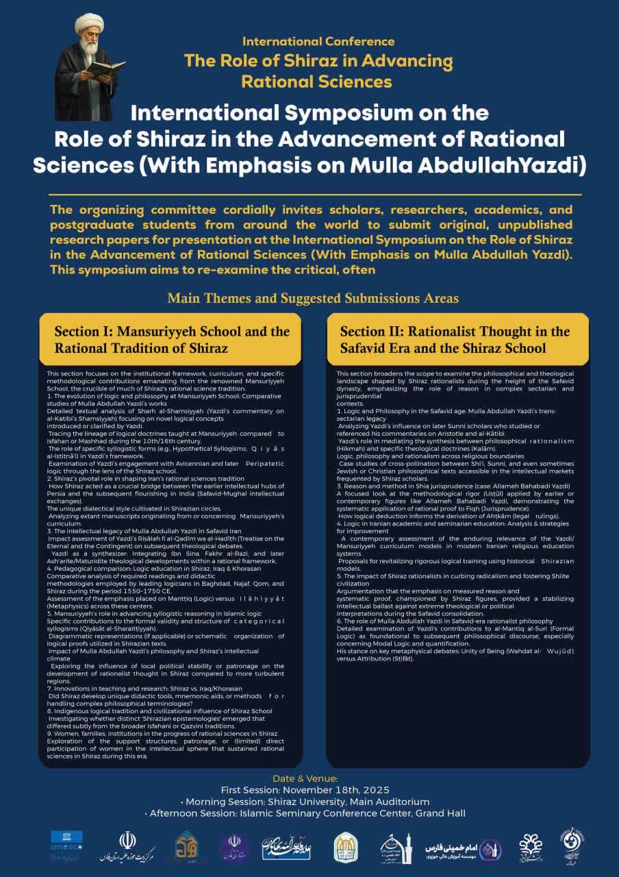 Scholars, researchers, and postgraduate students are invited to submit original papers aligned with the event’s main themes. Submissions may cover the evolution of logic, comparative pedagogy, philosophical crosscurrents between regions, and Yazdi’s impact on rationalist traditions.
