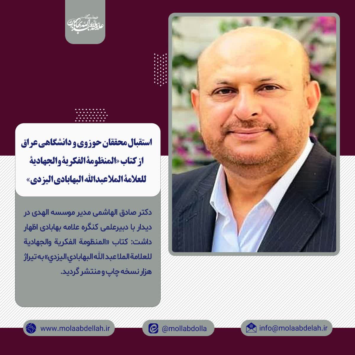 دکتر صادق الهاشمی مدیر موسسه الهدی در دیدار با دبیرعلمی کنگره علامه بهابادی اظهار داشتند: کتاب «المنظومة الفكرية والجهادية للعلامة الملا عبد الله البهابادي اليزدي» به تیراژ هزار نسخه چاپ و منتشر گردید. ایشان خاطر نشان کردند آشنایی بسیاری از اساتید و پژوهشگران حوزوی و دانشگاهی عراق مانند دانشکده فلسفه مستنصریه با علامه جای شگفتی دارد. ما ناچار شدیم چهار صد نسخه دیگر را چاپ کنیم و برای همه کتابخانه مهم و بیوت مراجع ارسال نمایم.