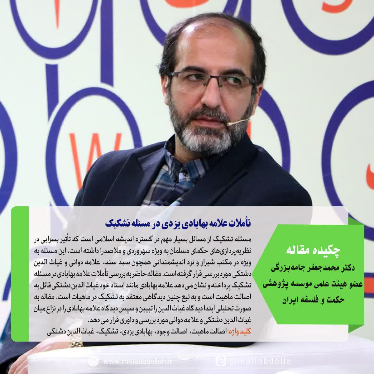 مسئله تشکیک از مسائل بسیار مهم در گستره اندیشه اسلامی است که تأثیر بسزایی در نظریهپردازیهای حکمای مسلمان به ویژه سهروردی و ملاصدرا داشته است. این مسئله به ویژه در مکتب شیراز و نزد اندیشمندانی همچون سید سند، علامه دوانی و غیاث الدین دشتکی مورد بررسی قرار گرفته است. مقاله حاضر به بررسی تأملات علامه بهابادی در مسئله تشکیک پرداخته و نشان می دهد علامه بهابادی مانند استاد خود غیاث الدین دشتکی قائل به اصالت ماهیت است و به تبع چنین دیدگاهی معتقد به تشکیک در ماهیات است. مقاله به صورت تحلیلی ابتدا دیدگاه غیاث الدین را تبیین و سپس دیدگاه علامه بهابادی را در نزاع میان غیاث الدین دشتکی و علامه دوانی مورد بررسی و داوری قرار می دهد.