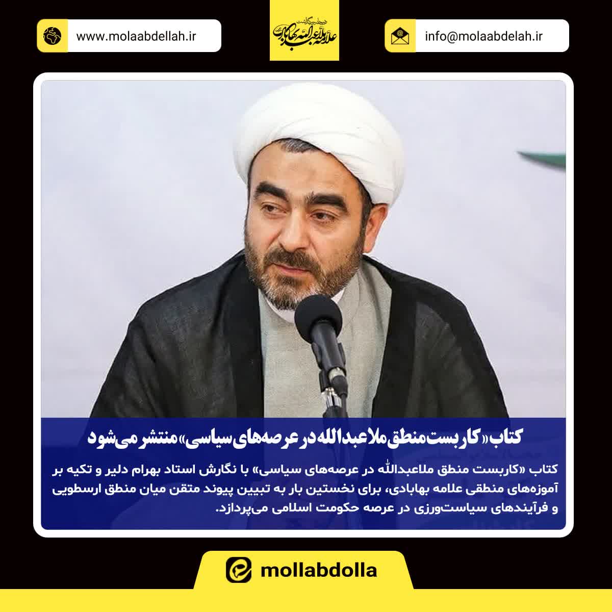 کتاب «کاربست منطق ملاعبدالله در عرصههای سیاسی» با نگارش استاد بهرام دلیر و تکیه بر آموزههای منطقی علامه بهابادی، برای نخستین بار به تبیین پیوند متقن میان منطق ارسطویی و فرآیندهای سیاستورزی در عرصه حکومت اسلامی میپردازد.